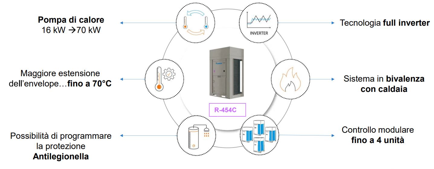 La nuova serie di pompe di calore compatta con Inverter e R-454C è disponibile in tre diversi layout, con un ingombro molto ridotto nonostante la capacità che e in grado di offrire. Ciò rende questa serie una soluzione perfetta per progetti con vincoli in termini di spazio negli ambiti residenziale, alberghiero e ospedaliero. Non sono necessarie ulteriori contromisure di sicurezza in quanto l’R-454C e un refrigerante A2L, come il popolare refrigerante R-32.