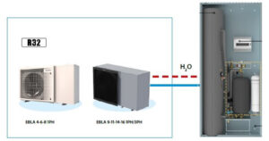 Sistema in pompa di calore aria/acqua del tipo refrigerant split in R32, composto da unità esterna ad inverter e unità interna per riscaldamento, raffrescamento e produzione acqua calda sanitaria