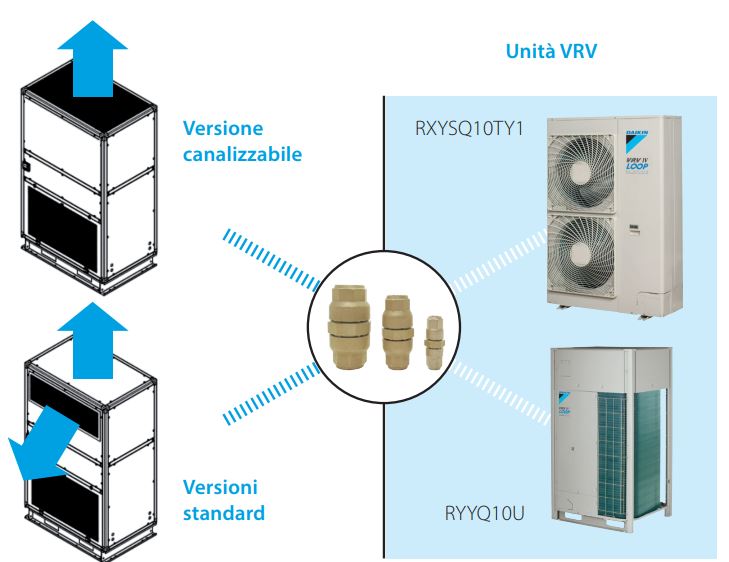 Tutte e tre le configurazioni sono collegabili alle unità esterne VRV in pompa di calore RYYQ10U e RXYSQ10TY.